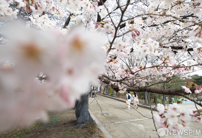 [서울=뉴스핌] 윤창빈 기자 = 완연한 봄 날씨를 보인 6일 오후 서울 송파구의 한 산책길에서 시민들이 벚꽃을 보며 나들이를 즐기고 있다. 2022.04.06 pangbin@newspim.com