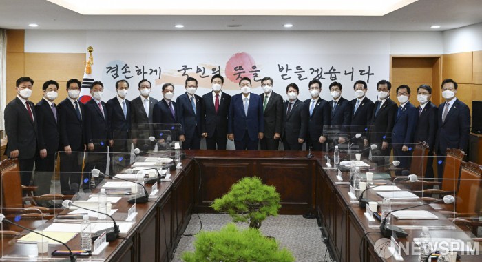 [서울=뉴스핌] 윤석열 대통령 당선인이 6일 오후 서울 종로구 통의동 제20대 대통령직인수위원회에서 열린 시도지사 간담회에서 참석자들과 기념촬영하고 있다. [사진=대통령직인수위원회] 2022.04.06 photo@newspim.com