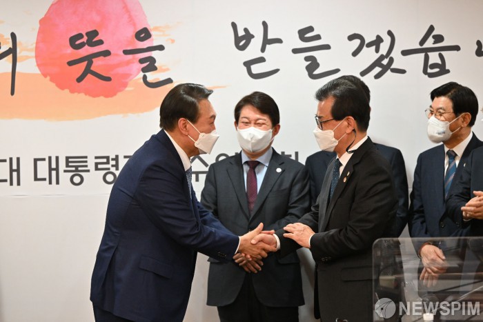 [서울=뉴스핌] 윤석열 대통령 당선인이 6일 오후 서울 종로구 통의동 제20대 대통령직인수위원회에서 열린 시도지사 간담회에서 참석자들과 인사하고 있다. [사진=대통령직인수위원회] 2022.04.06 photo@newspim.com