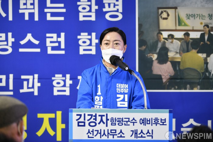 [광주=뉴스핌] 전경훈 기자 = 김경자 함평군수 예비후보가 7일 사무실 개소식을 열고 인사말을 하고 있다. 2022.04.07 kh10890@newspim.com