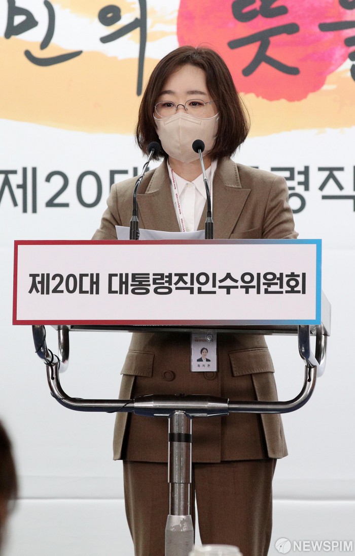 [서울=뉴스핌] 인수위사진기자단 = 최지현 대통령직인수위원회 수석부대변인이 8일 서울 종로구 통의동 제20대 대통령직인수위원회 브리핑룸에서 정례브리핑을 하고 있다. 2022.04.08 photo@newspim.com