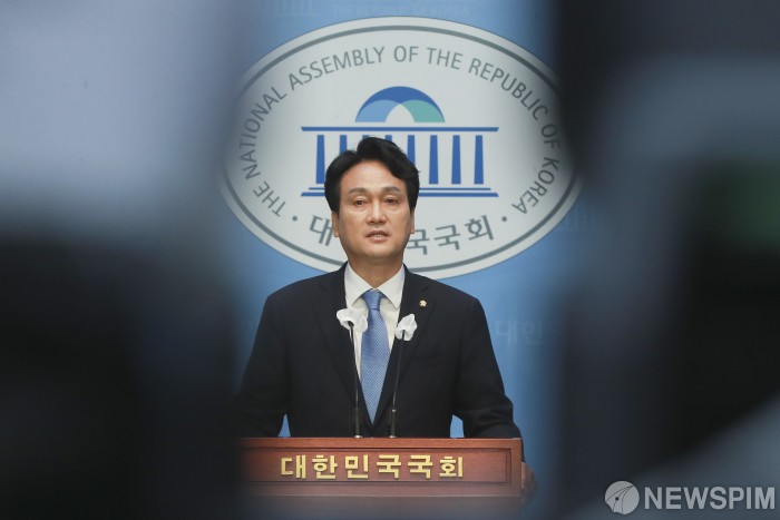 [서울=뉴스핌] 이형석 기자 = 안민석 더불어민주당 경기도지사 예비후보가 10일 오전 서울 여의도 국회 소통관에서 경기도지사후보 3자 단일화 제안 기자회견을 열고 있다. 2022.04.10 leehs@newspim.com