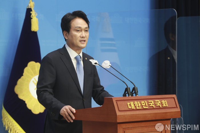 [서울=뉴스핌] 이형석 기자 = 안민석 더불어민주당 경기도지사 예비후보가 10일 오전 서울 여의도 국회 소통관에서 경기도지사후보 3자 단일화 제안 기자회견을 열고 있다. 2022.04.10 leehs@newspim.com