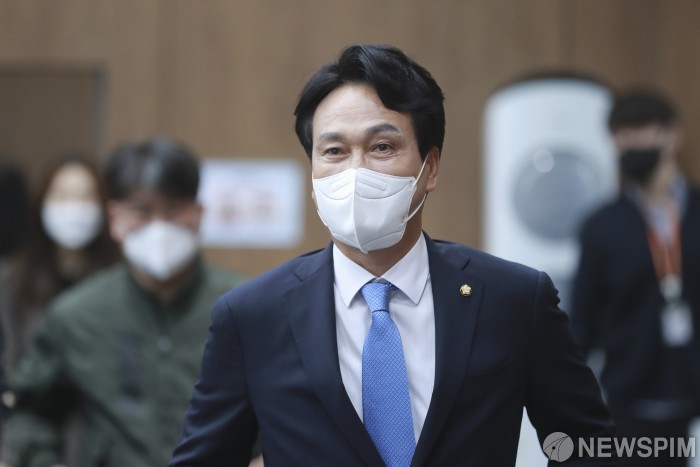 [서울=뉴스핌] 이형석 기자 = 안민석 더불어민주당 경기도지사 예비후보가 10일 오전 서울 여의도 국회 소통관에서 경기도지사후보 3자 단일화 제안 기자회견을 위해 입장하고 있다. 2022.04.10 leehs@newspim.com