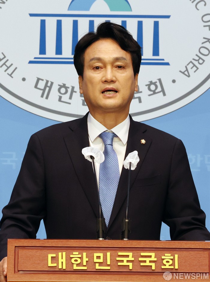 [서울=뉴스핌] 이형석 기자 = 안민석 더불어민주당 경기도지사 예비후보가 10일 오전 서울 여의도 국회 소통관에서 경기도지사후보 3자 단일화 제안 기자회견을 열고 있다. 2022.04.10 leehs@newspim.com