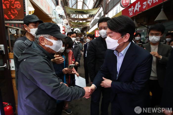 [서울=뉴스핌] 인수위사진기자단 = 안철수 대통령직 인수위원회 위원장이 10일 서울 종로구 통인시장을 방문해 시민들과 인사하고 있다. 2022.04.10 photo@newspim.com