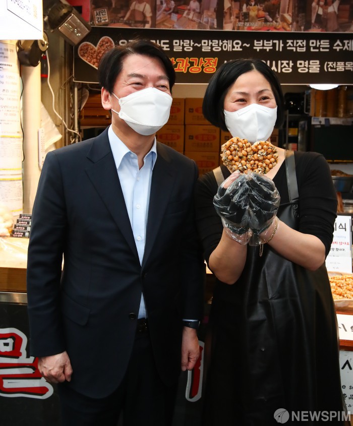 [서울=뉴스핌] 인수위사진기자단 = 안철수 대통령직 인수위원회 위원장이 10일 서울 종로구 통인시장을 방문해 한과집 상인과 기념촬영을 하고 있다. 2022.04.10 photo@newspim.com