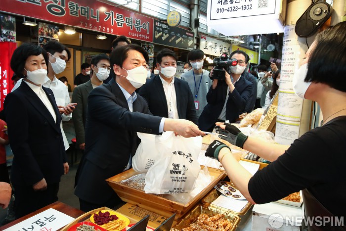 [서울=뉴스핌] 인수위사진기자단 = 안철수 대통령직 인수위원회 위원장이 10일 서울 종로구 통인시장을 방문해 한과집에서 강정을 사고 있다. 2022.04.10 photo@newspim.com