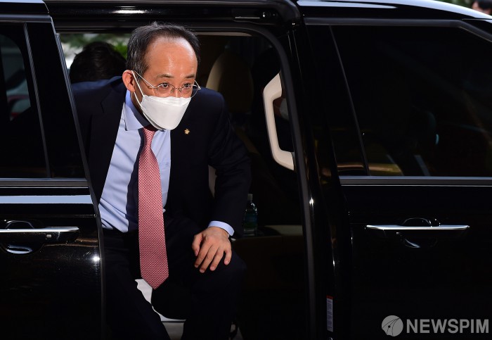 [서울=뉴스핌] 이형석 기자 = 윤석열 정부 첫 부총리 후보로 내정된 추경호 대통령직인수위원회 기획조정분과 간사(국민의힘 의원)가 10일 오후 서울 중구 은행회관에서 간담회를 하기 위해 들어서고 있다. 2022.04.10 leehs@newspim.com