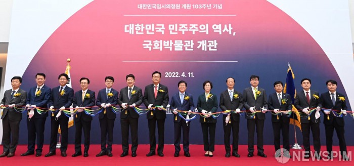 [서울=뉴스핌] 이형석 기자 = 박병석 국회의장을 비롯한 참석자들이 11일 오전 서울 여의도 국회박물관 개관식에서 리본커팅을 하고 있다. 2022.04.11 leehs@newspim.com