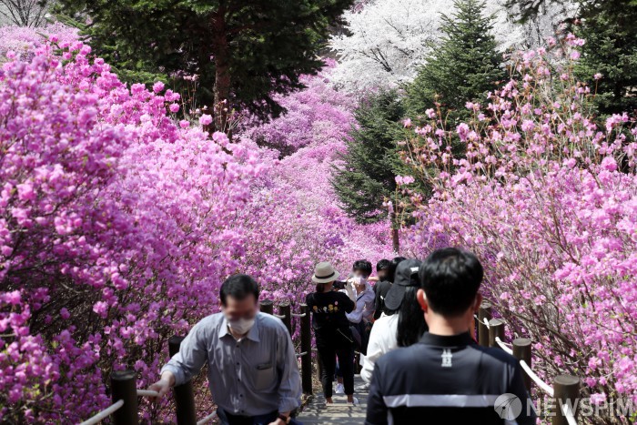 [부천=뉴스핌] 정일구 기자 = 완연한 봄 날씨를 보인 11일 오후 경기 부천시 진달래동산을 찾은 시민들이 만개한 진달래꽃을 보며 봄기운을 만끽하고 있다. 2022.04.11 mironj19@newspim.com