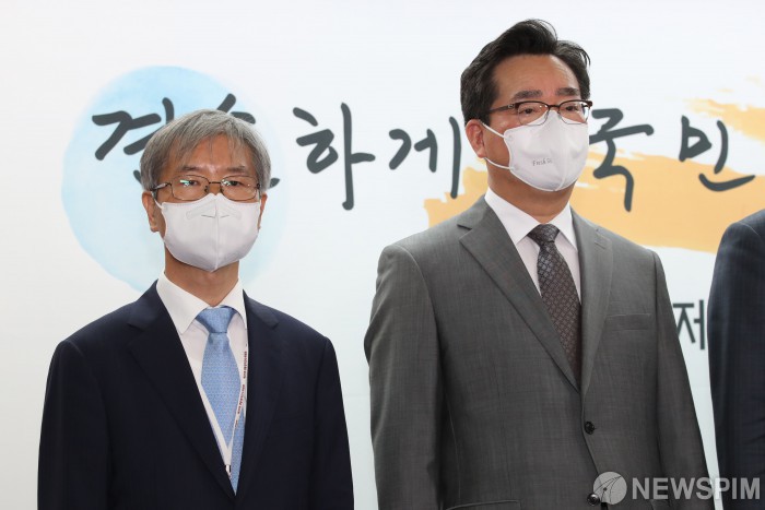 [서울=뉴스핌] 인수위사진기자단 = 윤석열 대통령 당선인이 14일 오후 서울 종로구 통의동 대통령직인수위원회 브리핑룸에서 추가 인선 발표를 한 가운데 이정식 고용노동부 장관 후보자와 정황근 농림축산식품부 장관 후보자가 자리하고 있다. 2022.04.14 photo@newspim.com