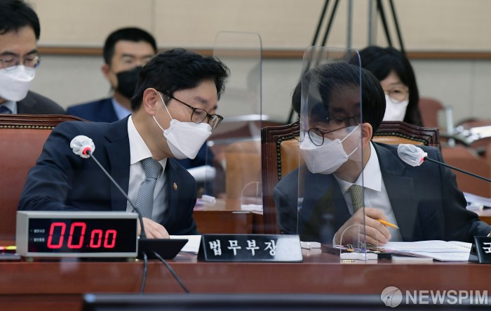 [서울=뉴스핌] 최상수 기자 = 박범계 법무부 장관(왼쪽)과 박재민 국방부 차관이 14일 오후 서울 여의도 국회에서 열린 법제사법위원회 전체 회의에서 대화를 나누고 있다. 2022.04.14 kilroy023@newspim.com