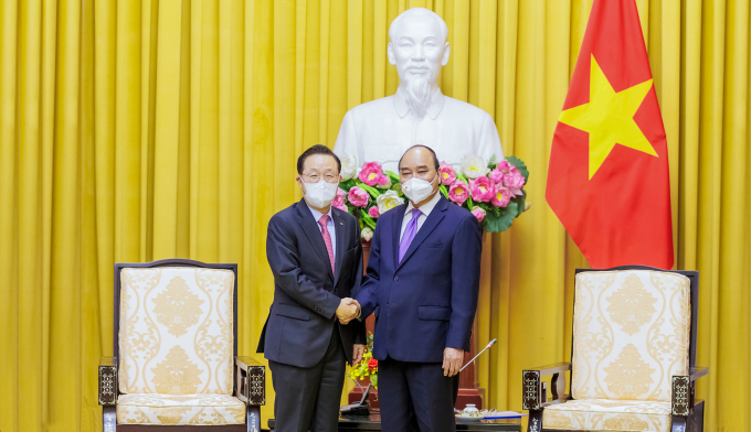 이에 응우옌 쑤언 푹 주석은 "올해로 한·베트남 수교 30주년을 맞아 한국기업들의 더 많은 진출과 투자를 기대하고, 특히 부품소재산업 중소기업들의 활발한 진출을 위해 양국이 더욱 돈독한 협력관계를 구축하기를 희망한다"고 화답했다.