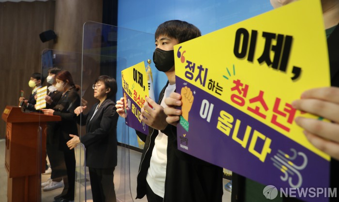 [서울=뉴스핌] 이형석 기자 = 15일 서울 여의도 국회 소통관에서 열린 2022 지방선거 정의당 만 18세, 만 19세 청소년 출마 기자회견에서 정의당 청소년 당원들이 '이제 정치하는 청소년이 옵니다'라고 씌여진 손팻말을 들고 있다. 정의당에서는 노서진 정의당 청소년 위원장(만 19세)과 이재혁 경기도당 청소년위원장(만 18세)이 이번 지방선거에서 서울시의원과 경기도의원에 각각 출마한다. 2022.04.15 leehs@newspim.com