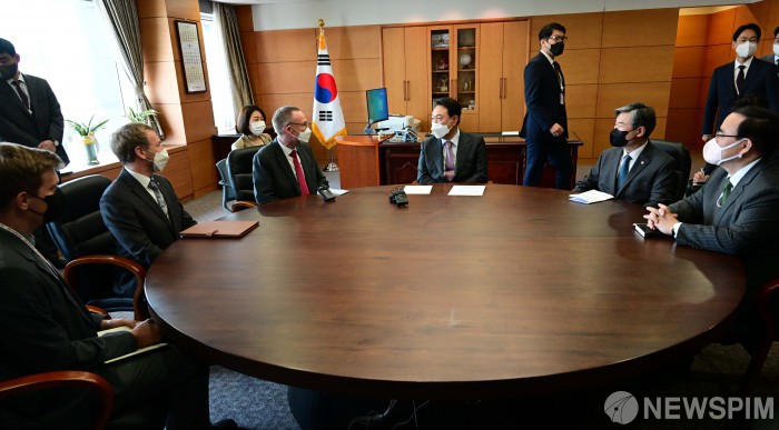 [서울=뉴스핌] 인수위사진기자단 = 윤석열 대통령 당선인이 15일 오전 서울 종로구 통의동 대통력직인수위원회에서 콜린 크룩스 주한영국대사 내정자를 접견하고 있다. 2022.04.15 photo@newspim.com