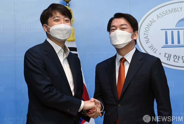 [서울=뉴스핌] 최상수 기자 = 이준석 국민의힘 대표와 안철수 국민의당 대표가 18일 서울 여의도 국회 소통관에서 양 당 간 합당을 공식 선언한 후 악수하고 있다. 2022.04.18 kilroy023@newspim.com