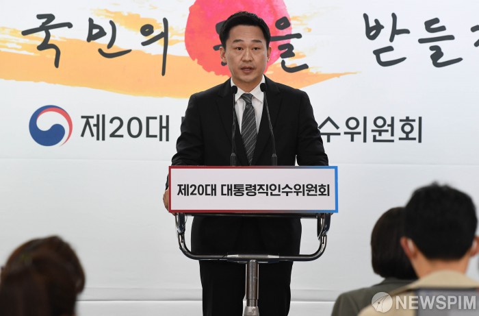 [서울=뉴스핌] 인수위사진기자단 = 차승훈 대통령직인수위원회 부대변인이 20일 서울 종로구 통의동 인수위 기자회견장에서 공공기관 관리시스템 강화방안 관련 브리핑을 하고 있다. 2022.04.20 photo@newspim.com