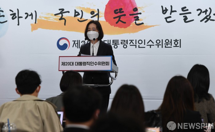[서울=뉴스핌] 인수위사진기자단 = 최지현 대통령직인수위원회 수석부대변인이 20일 서울 종로구 통의동 인수위 기자회견장에서 열린 정례브리핑에서 현안 관련 발표를 하고 있다. 2022.04.20 photo@newspim.com