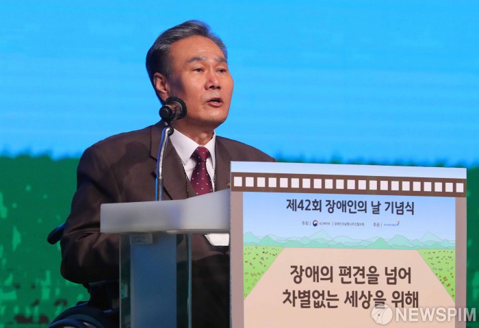 [서울=뉴스핌] 김학선 기자 = 김락환 장애인의날행사추진협의회장이 20일 오후 서울 여의도 콘래드 호텔에서 열린 제42회 장애인의 날 기념식에 참석해 인사말을 하고 있다. 2022.04.20 yooksa@newspim.com
