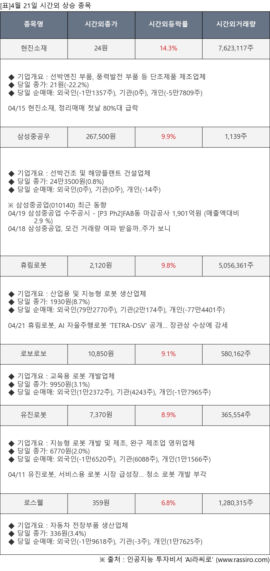 ※ 관련 종목: 현진소재, 삼성중공우, 휴림로봇, 로보로보, 유진로봇, 로스웰
