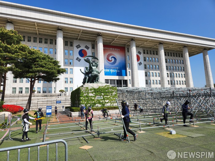 [서울=뉴스핌] 최상수 기자 = 26일 오전 서울 여의도 국회 본청 앞에서 취임준비관련 업체 인부들이 제20대 대통령취임식 준비를 위한 기초 가설물을 세우고 있다. 2022.04.26 kilroy023@newspim.com