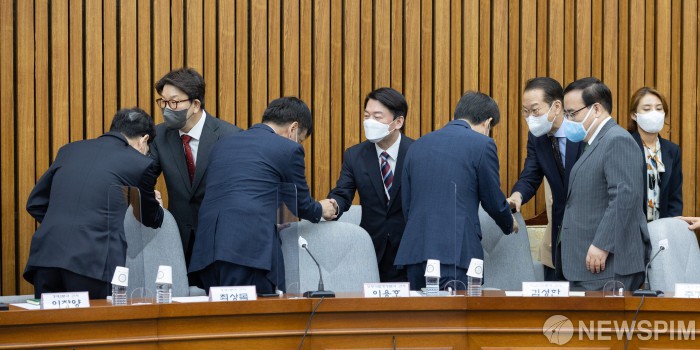 [서울=뉴스핌] 최상수 기자 = 안철수 대통령직인수위원회 위원장이 28일 오전 서울 여의도 국회에서 열린 국민의힘·대통령직인수위원회 당정협의에서 참석자들과 악수하고 있다. 2022.04.28 kilroy023@newspim.com