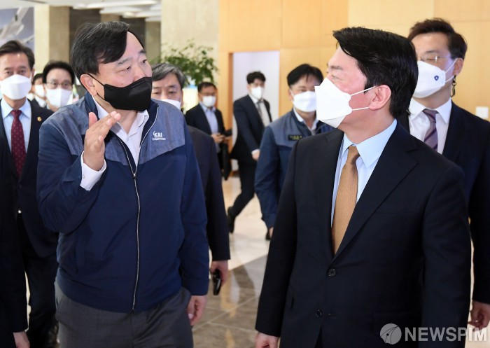 [서울=뉴스핌] 인수위사진기자단 = 안철수 대통령직인수위원장(오른쪽)이 1일 오전 경남 사천시 한국항공우주산업(KAI)에서 열린 우주항공산업 현장간담회에 참석해 안현호 KAI 대표와 대화를 하고 있다. 2022.05.01 photo@newspim.com