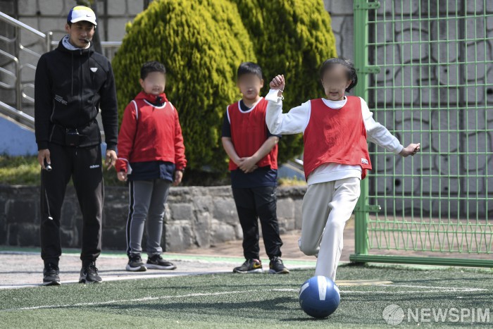 [서울=뉴스핌] 사진공동취재단 = 실외 체육수업 마스크 착용 의무가 해제된 2일 오전 서울 광진구 광장초등학교 학생들이 마스크를 벗고 체육 활동을 하고 있다. 2022.05.02 photo@newspim.com
