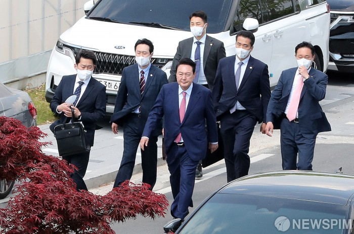 [수원=뉴스핌] 인수위사진기자단 = 윤석열 대통령 당선인이 2일 오후 경기 수원시 권선구 수원도시공사에서 열린 군비행장 소음 피해 주민간담회에 참석하고 있다. 2022.05.02 photo@newspim.com