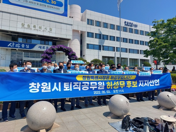 [창원=뉴스핌] 남경문 기자 = 창원시청 퇴직 공무원 100여명이 허성무 더불어민주당 창원특례시장 후보 지지를 선언했다.