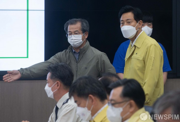 [서울=뉴스핌] 윤창빈 기자 = 오세훈 서울시장이 9일 오전 서울 중구 서울시청에서 열린 2022년 풍수해대책 추진현황 보고회에 참석하고 있다. 2022.05.09 pangbin@newspim.com