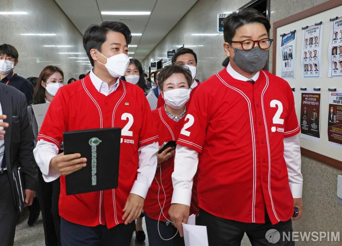 [서울=뉴스핌] 김민지 기자 = 이준석 국민의힘 대표와 공동선대위원장으로 선임된 권성동 원내대표가 9일 오전 국회에서 열린 제8회 전국동시지방선거 중앙선거대책위원회 제1차 회의를 하기위해 입장하고 있다. 2022.05.09 kimkim@newspim.com