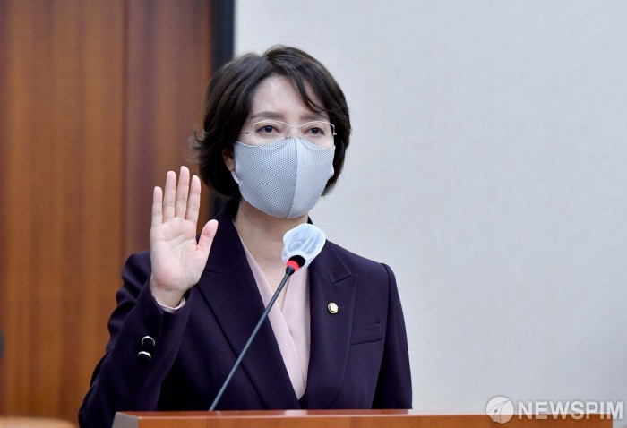 [서울=뉴스핌] 최상수 기자 = 이영 중소벤처기업부 장관 후보자가 11일 서울 여의도 국회에서 열린 인사청문회에서 선서를 하고 있다. 2022.05.11 kilroy023@newspim.com