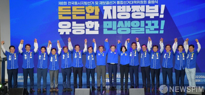 [서울=뉴스핌] 김민지 기자 = 이재명 더불어민주당 총괄선대위원장을 비롯한 지방선거 후보자들이 11일 오전 국회 의원회관에서 열린 전국지방선거·재보궐선거 통합선거대책위원회 출범식 및 공천장 수여식에서 기념촬영을 하고 있다. 2022.05.11 kimkim@newspim.com
