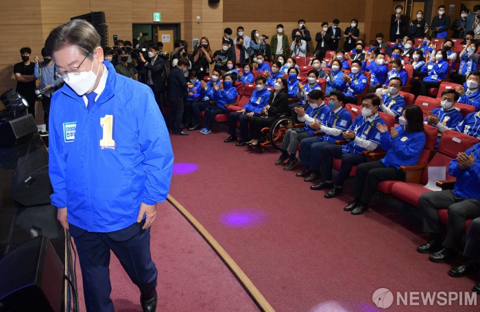 [서울=뉴스핌] 김민지 기자 = 이재명 더불어민주당 총괄선대위원장이 11일 오전 국회 의원회관에서 열린 전국지방선거·재보궐선거 통합선거대책위원회 출범식 및 공천장 수여식에서 인사말을 하기 위해 단상으로 향하고 있다. 2022.05.11 kimkim@newspim.com