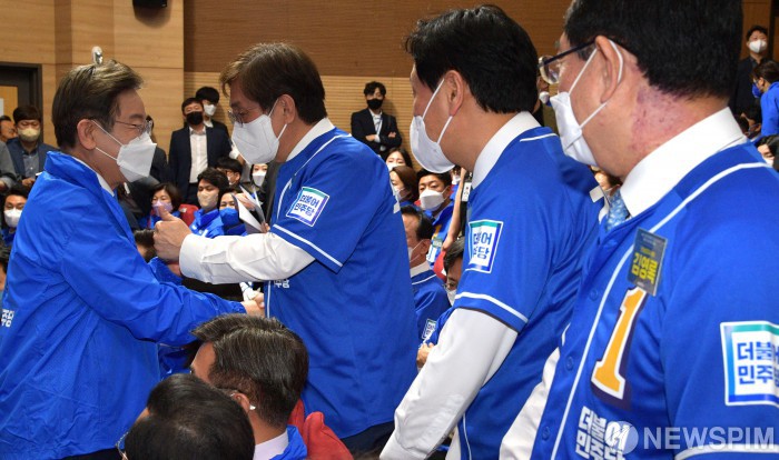 [서울=뉴스핌] 김민지 기자 = 이재명 더불어민주당 총괄선대위원장이 11일 오전 국회 의원회관에서 열린 전국지방선거·재보궐선거 통합선거대책위원회 출범식 및 공천장 수여식에서 노영민 충북도지사 후보 등과 인사를 하고 있다. 2022.05.11 kimkim@newspim.com