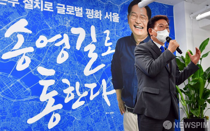 [서울=뉴스핌] 김민지 기자 = 송영길 더불어민주당 서울시장 후보가 12일 오전 서울 중구 무교동 캠프사무실에서 열린 '송영길 뚜벅이 봉사단 발대식'에서 인사말을 하고 있다. 2022.05.12 kimkim@newspim.com