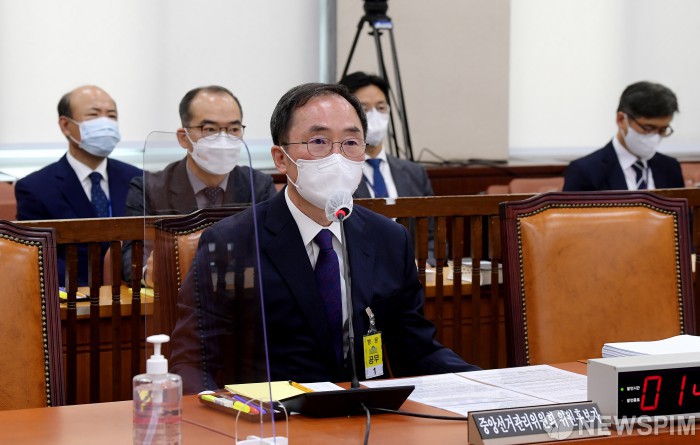 [서울=뉴스핌] 최상수 기자 = 김필곤 중앙선거관리위원회 상임위원 후보자가 13일 오전 서울 여의도 국회 행정안전위원회에서 열린 인사청문회에서 의원들의 질의에 답하고 있다. 2022.05.13 kilroy023@newspim.com