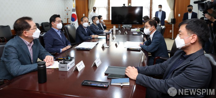 [서울=뉴스핌] 김민지 기자 = 추경호 경제부총리 겸 기획재정부 장관(왼쪽 세번째)이 15일 오후 서울 종로구 정부서울청사에서 열린 경제관계장관 간담회에서 모두발언을 하고 있다. 윤석열 정부 출범 이후 처음으로 열린 이날 회의에서는 물가 등 민생현안 관련 논의가 이뤄졌다. 2022.05.15 kimkim@newspim.com