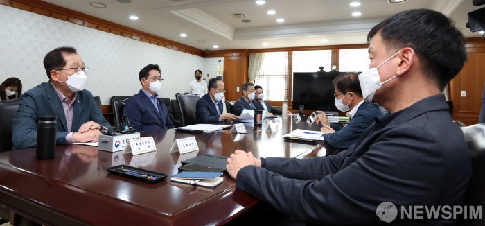 [서울=뉴스핌] 김민지 기자 = 추경호 경제부총리 겸 기획재정부 장관(왼쪽 세번째)이 15일 오후 서울 종로구 정부서울청사에서 열린 경제관계장관 간담회에서 모두발언을 하고 있다. 윤석열 정부 출범 이후 처음으로 열린 이날 회의에서는 물가 등 민생현안 관련 논의가 이뤄졌다. 2022.05.15 kimkim@newspim.com