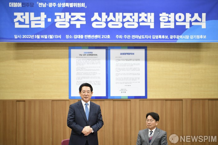 [광주=뉴스핌] 전경훈 기자 = 김영록 전남지사(왼쪽) 후보와 강기정 광주시장 후보가 16일 광주 서구 치평동 김대중컨벤션센터에서 전남·광주 상생 정책 협약식을 열고 있다. 2022.05.16 kh10890@newspim.com