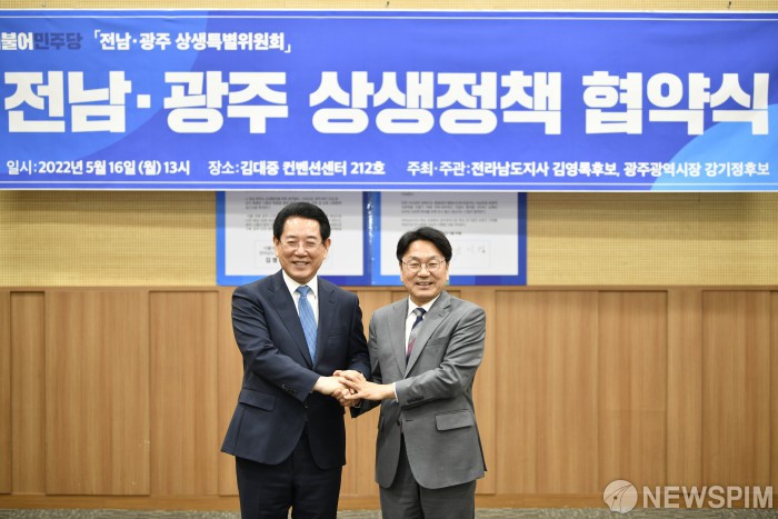 [광주=뉴스핌] 전경훈 기자 = 더불어민주당 소속 김영록 전남지사(왼쪽) 후보와 강기정 광주시장 후보가 16일 광주 서구 치평동 김대중컨벤션센터에서 전남·광주 상생 정책 협약식을 열고 있다. 2022.05.16 kh10890@newspim.com