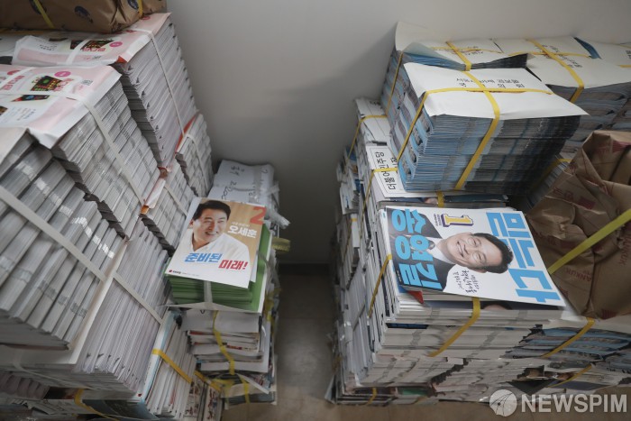[서울=뉴스핌] 이형석 기자 = 제8회 전국동시지방선거 공식 선거운동을 하루 앞둔 18일 오전 서울시선거관리위원회 복도에 후보들의 공보물이 쌓여 있다. 제8회 전국동시지방선거는 6월 1일 실시된다. 2022.05.18 leehs@newspim.com