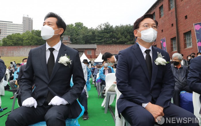 [서울=뉴스핌] 김민지 기자 = 오세훈 국민의힘 서울시장 후보와 송영길 더불어민주당 서울시장 후보가 18일 오전 서울 서대문형무소역사관에서 열린 5·18 기념식에 참석해 자리해 있다. 2022.05.18 kimkim@newspim.com