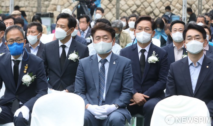 [서울=뉴스핌] 김민지 기자 = 오세훈 국민의힘 서울시장 후보와 송영길 더불어민주당 서울시장 후보가 18일 오전 서울 서대문형무소역사관에서 열린 5·18민중항쟁 제42주년 서울기념식에 참석해 있다. 2022.05.18 kimkim@newspim.com
