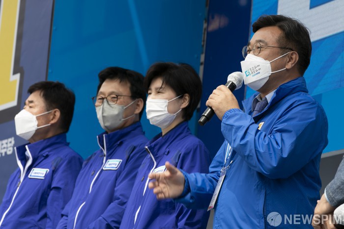 [수원=뉴스핌] 국회사진취재단 = 윤호중 더불어민주당 공동비상대책위원장이 6·1 지방선거 공식선거운동 첫날인 19일 오전 경기도 수원시 팔달구 지동교에서 열린 더불어민주당 경기도지사 후보 유세단 출정식에서 지지 연설을 하고 있다. 2022.05.19 photo@newspim.com