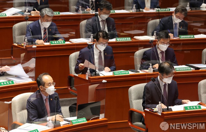[서울=뉴스핌] 김민지 기자 = 추경호 국무총리 직무대행(경제부총리 겸 기획재정부 장관)이 20일 오전 국회에서 열린 예결위 전체회의에서 의원 질의에 답변하고 있다. 2022.05.20 kimkim@newspim.com