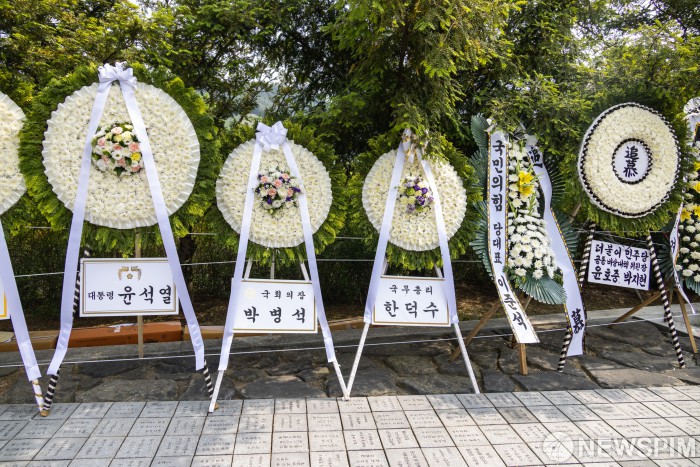 [김해=뉴스핌] 최상수 기자 = 23일 경남 김해시 봉하마을에 고 노무현 대통령의 13주기를 맞아 윤석열 대통령, 박병석 국회의장, 한덕수 국무총리, 여야 당대표들의 근조환이 놓여 있다. 2022.05.23 kilroy023@newspim.com