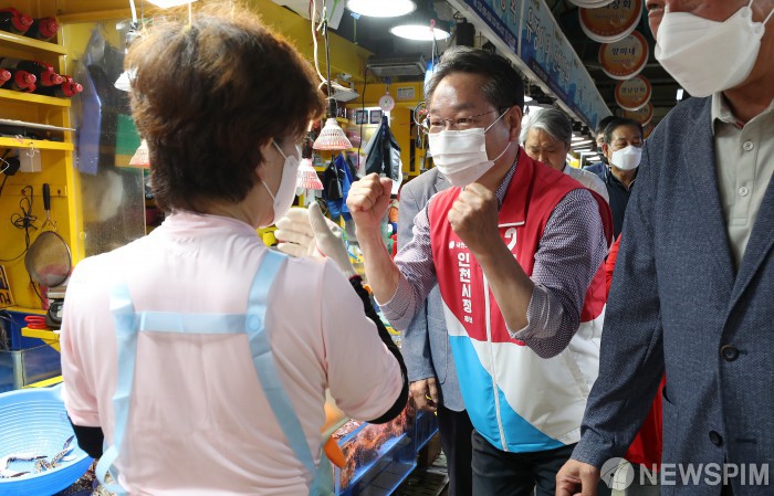 인천종합어시장 상인들 지지 호소하는 유정복 후보